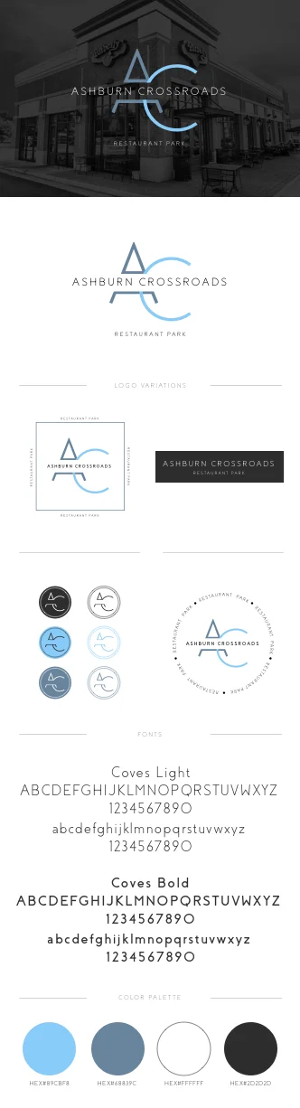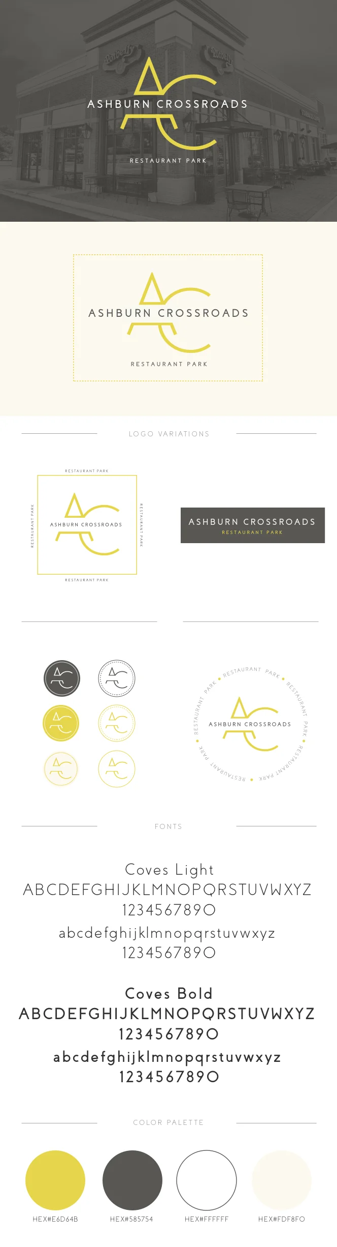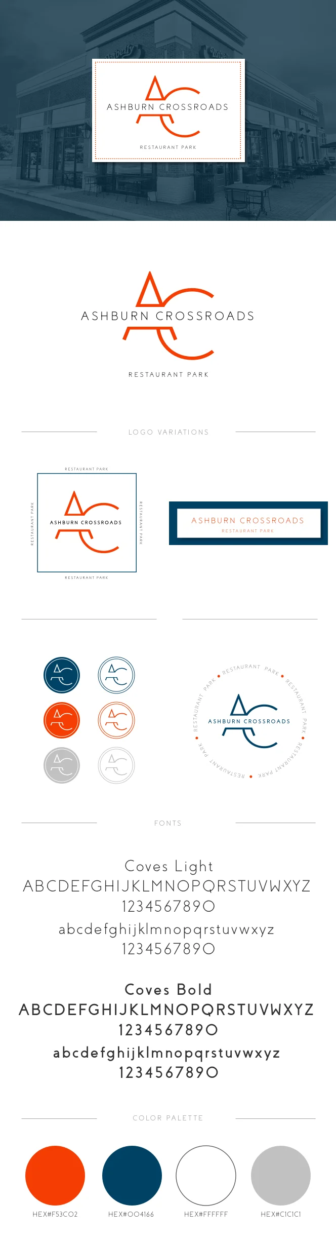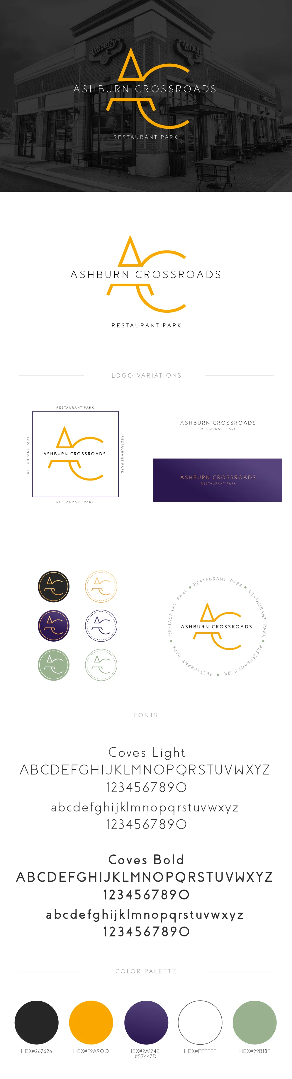 Ashburn Crossroads Restaurant Park is a family owned business that provides growing companies with leasing opportunities in Ashburn, VA. They currently house popular restaurants such as Starbucks, Potbelly, and Bertucci's, and are looking to grow throughout Virginia. This budding company needed to build their visual brand from the ground up. I wanted Ashburn Crossroads to stand out from their competitors and have the ability to flourish.